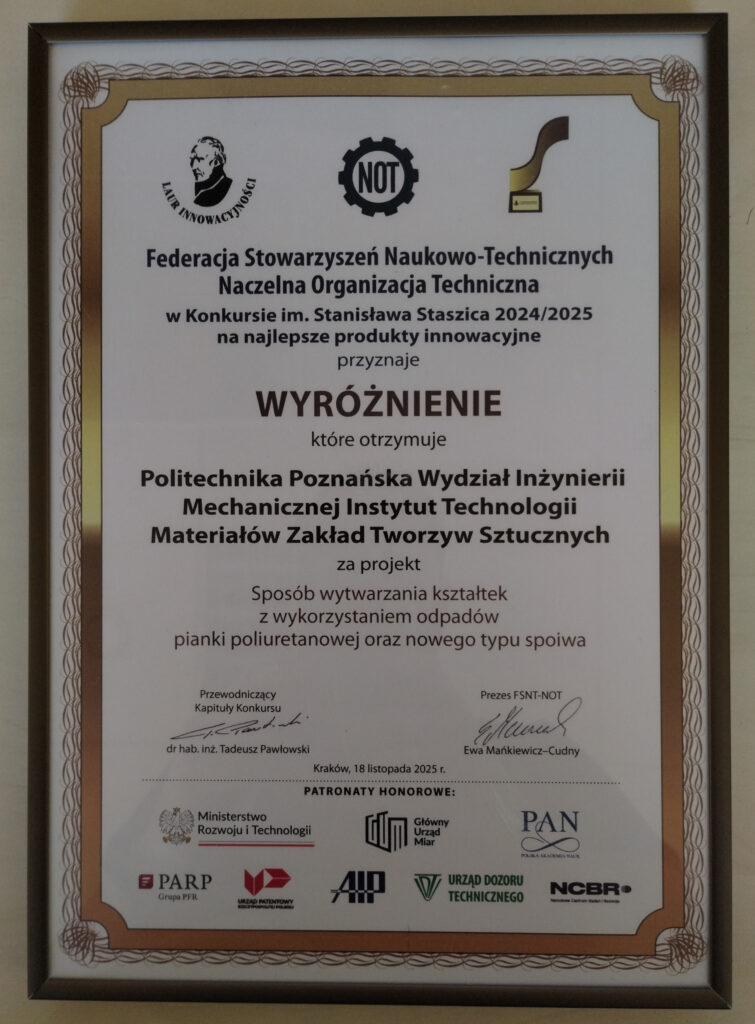 The award was granted for the development of Method of producing shapes using polyurethane foam waste and novel type of binder (Polish patent application P.448539), developed within the framework of InnoGOW project.