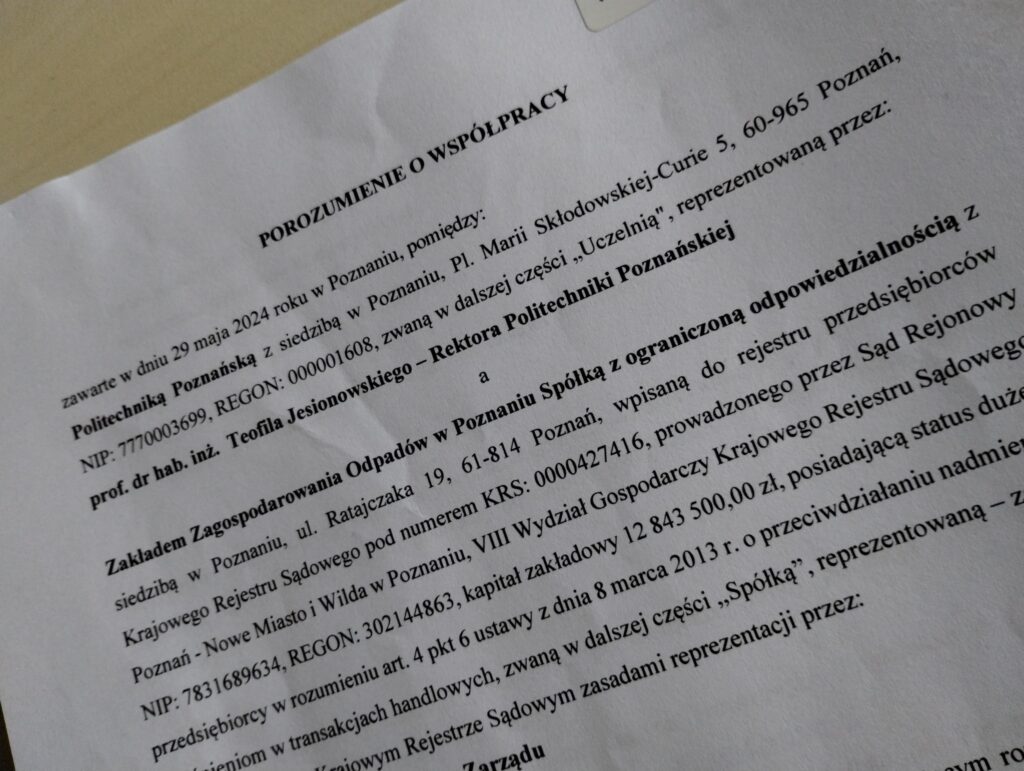 The first cooperation with the economic environment has already been formalized. The cooperation agreement between Poznan University of Technology and the Waste Reclamation Company Ltd. in Poznań was officially signed by representatives of both institutions.